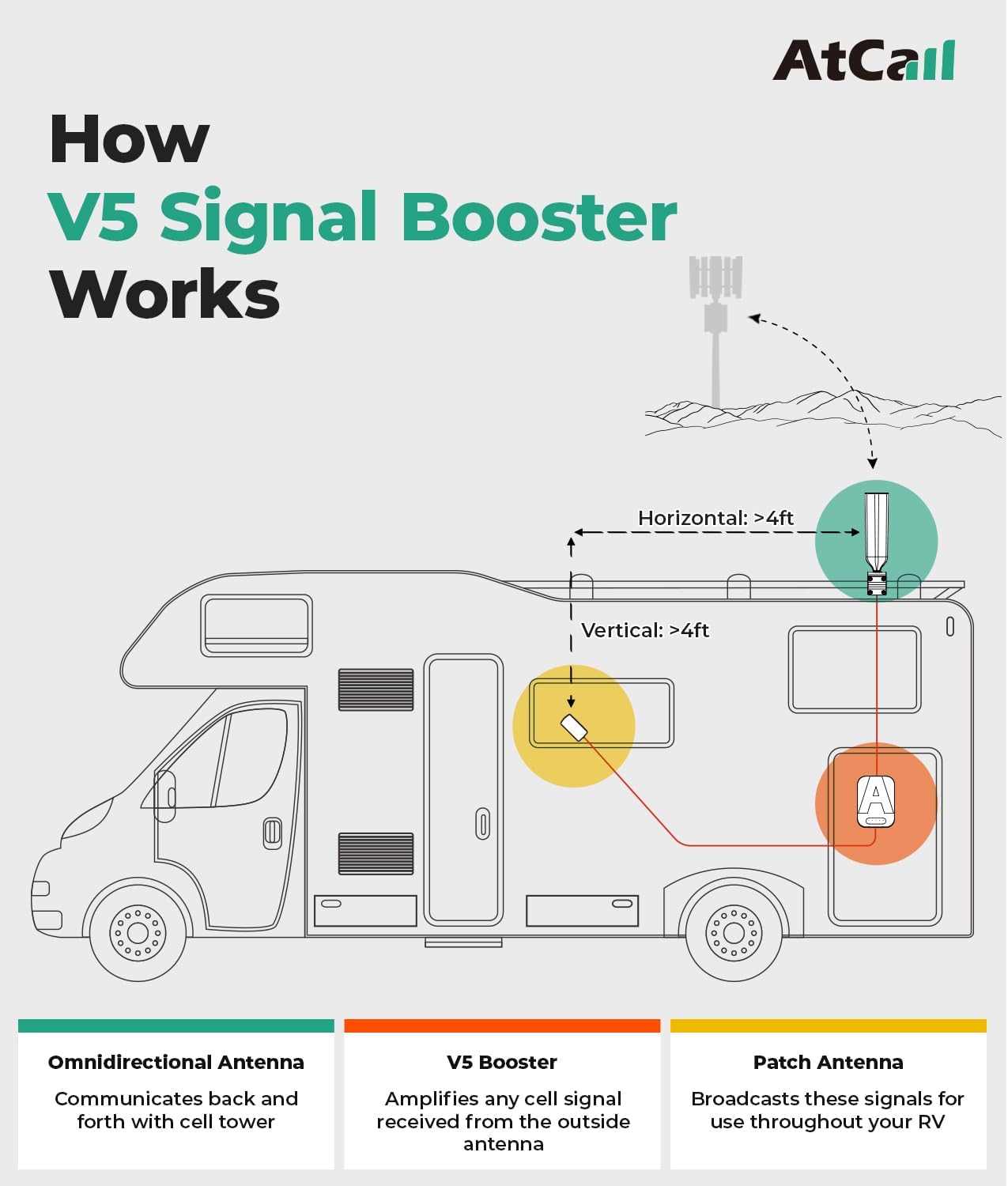 ăIdeal Cell Phone Booster for RV TruckăAtcall RV cell phone booster can powerfully boost your cellular devices signal, max gain to 50dB. Providing better voice quality and faster data speed, fewer missed/dropped calls, improved video streaming. Perfect for RV Truck Trailer Camper Travel