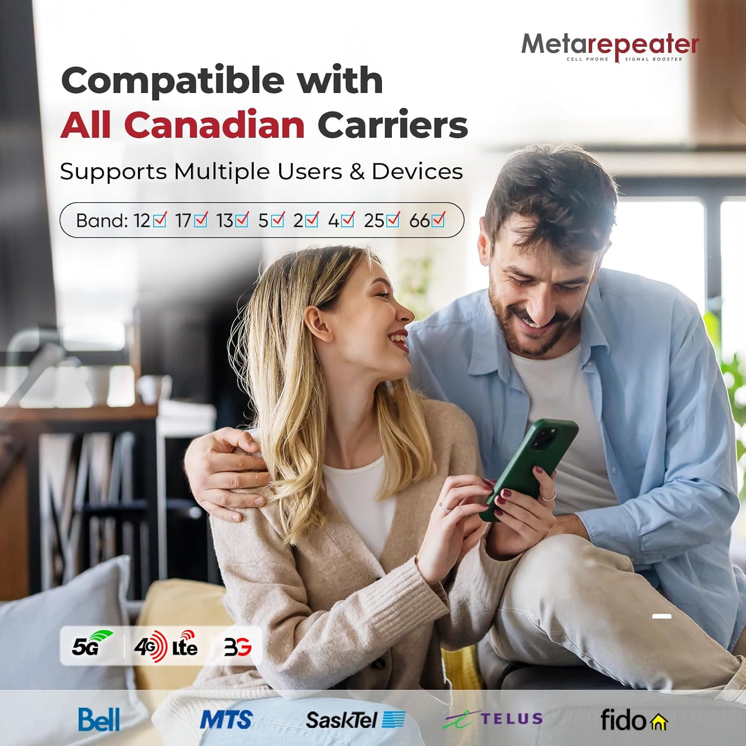 ăWorks with All U.S. Carriers & 5G CompatibilityăThe Metarepeater cell phone booster works on all cellular service providers – Verizon, AT&T, T-Mobile, Sprint, Straight Talk, and U.S. Cellular, etc. It amplifies signals on Bands 12/17, 13, 5, 2/25 and 4/66. The MG2 5G signa booster for home is a high-gain signal booster (70dB max gain) compatible with the latest 5G and 4G LTE technology. If you want to use 5G, make sure 5G is available in your area before you buy.