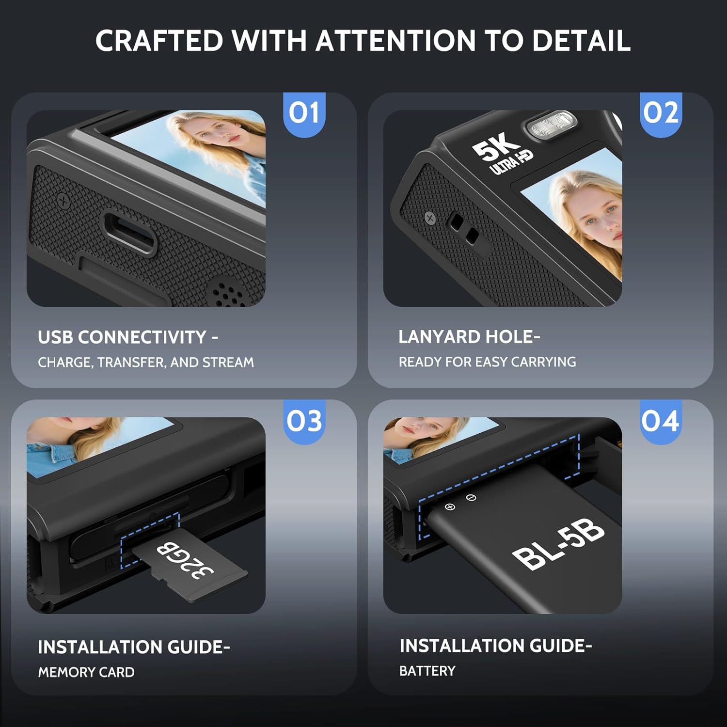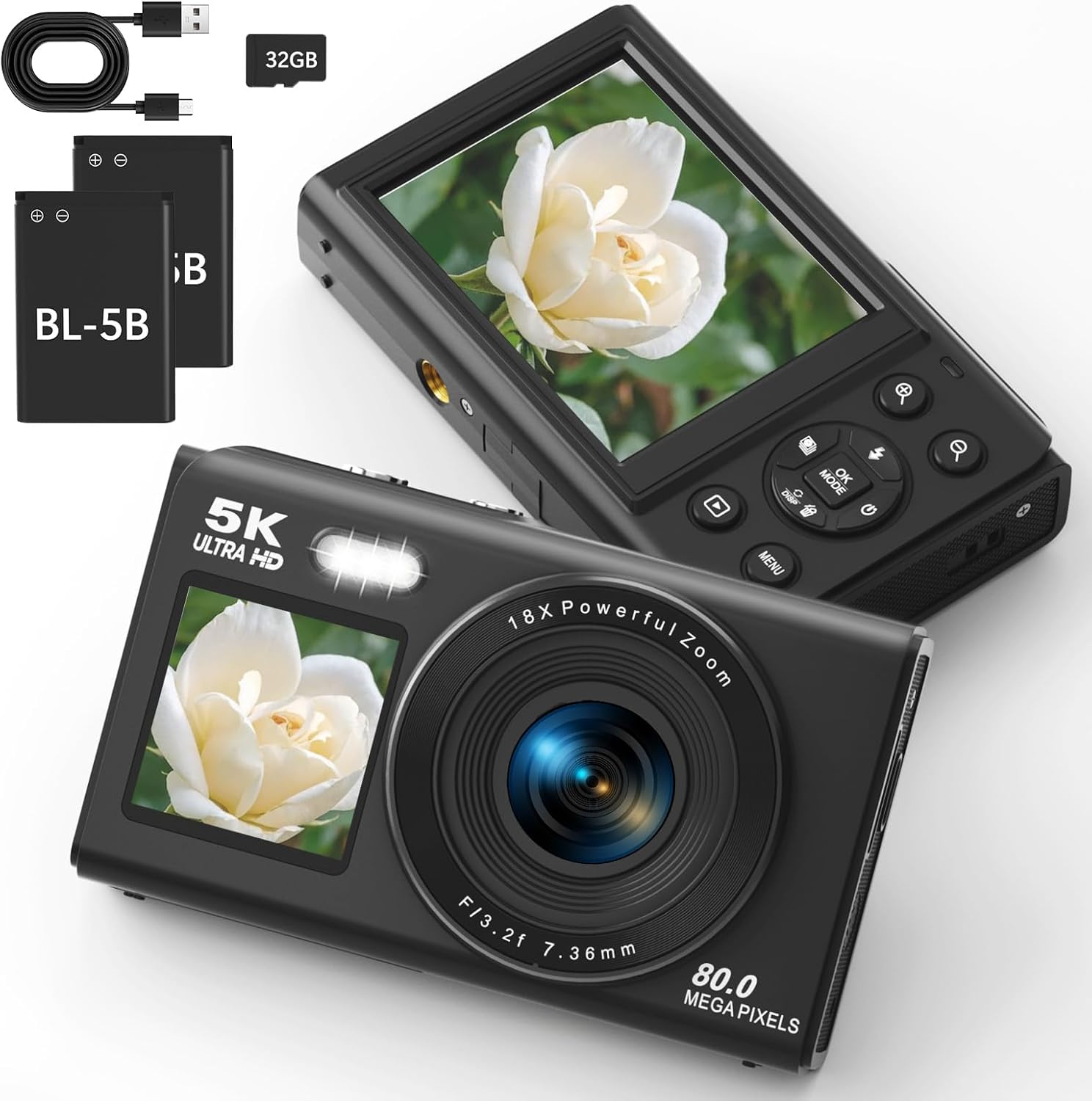 ăUpgraded 5K 80MP Digital CameraăThis 5K camera has been upgraded in terms of parameters, performance and appearance design, and the body is lighter and more portable. The DISP button on the front and back screens can switch screens with one click, which is extremely convenient to operate without any technical knowledge. Whether it is daily shooting, study life or weekend adventure, it is an ideal choice for beginners.
