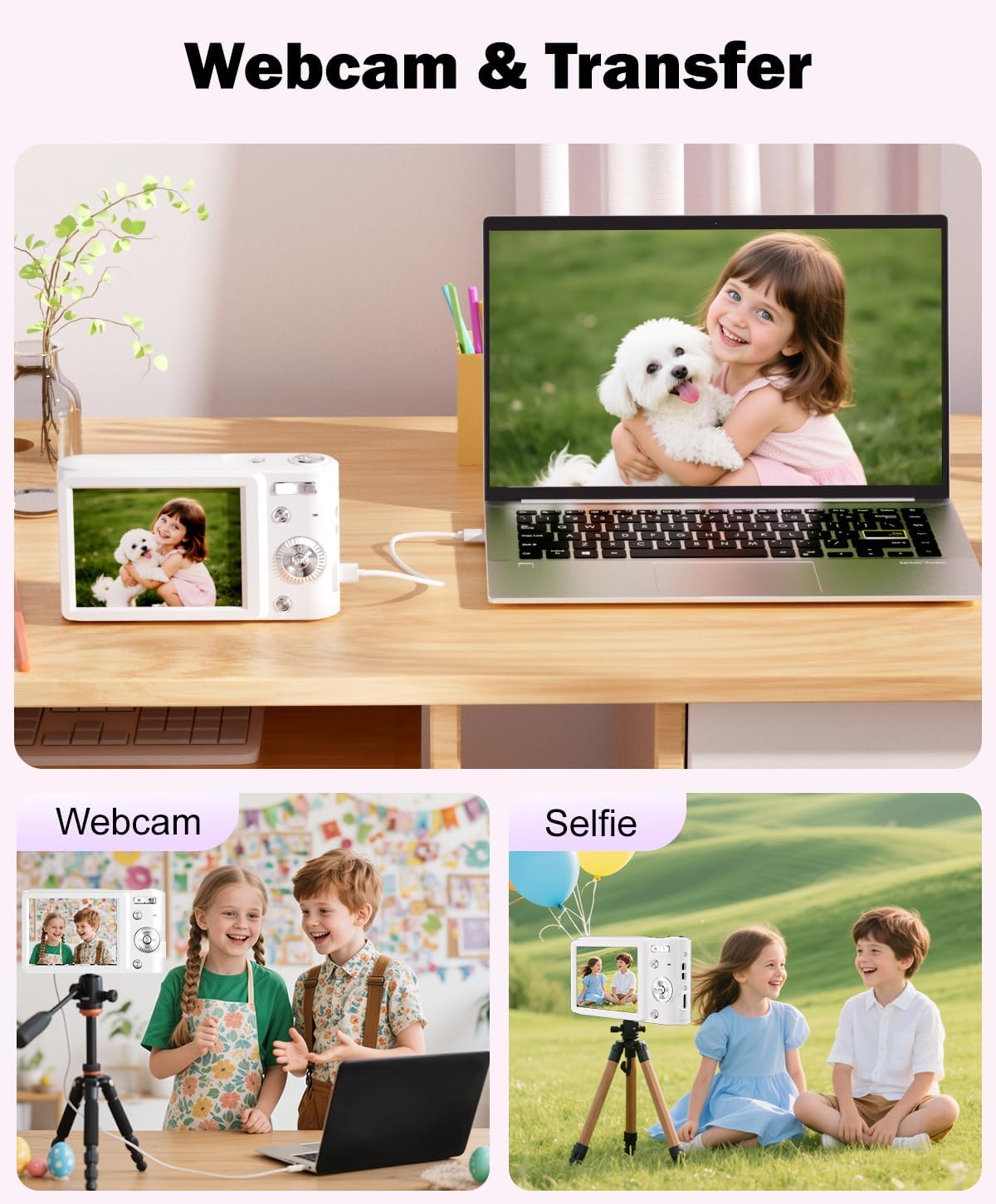 ăVlogging Rrecording & WebcamăThe vlogging camera supports video mode, you could gain clear recording videos. Just turn off the camera, connect it to your computer, press the shutter and power buttons at the same time and it will go into webcam mode.
