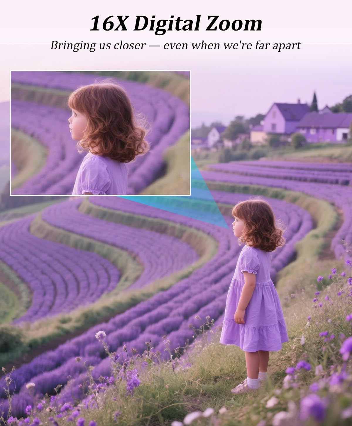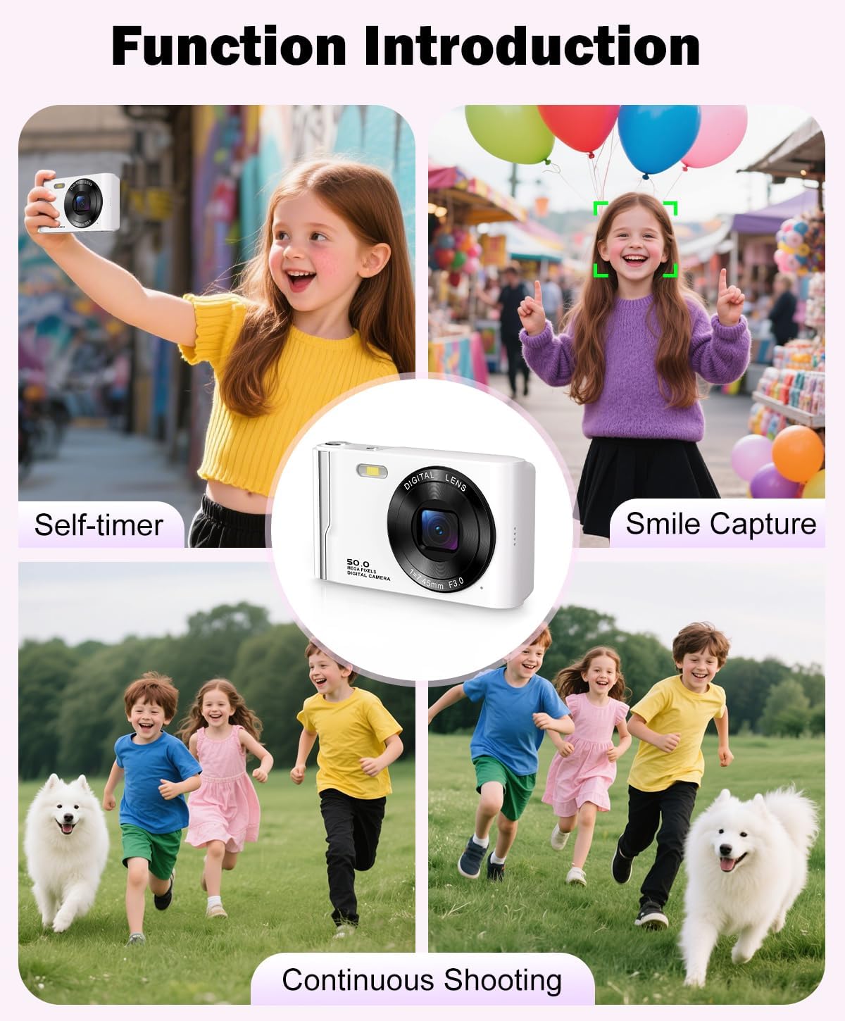 ă16X Digital Zoom & MultifuctionalăThe small digital camera supports 16X digital zoom and can be easily zoomed in and out while in use by pressing the W/T button. This mini camera was also equipped with anti-shake, face detection, smile detection, continuous shooting, and flexible capturing the shooting subject, serving as the perfect choice for documenting family gatherings, friend meetups, and other joyful moments.