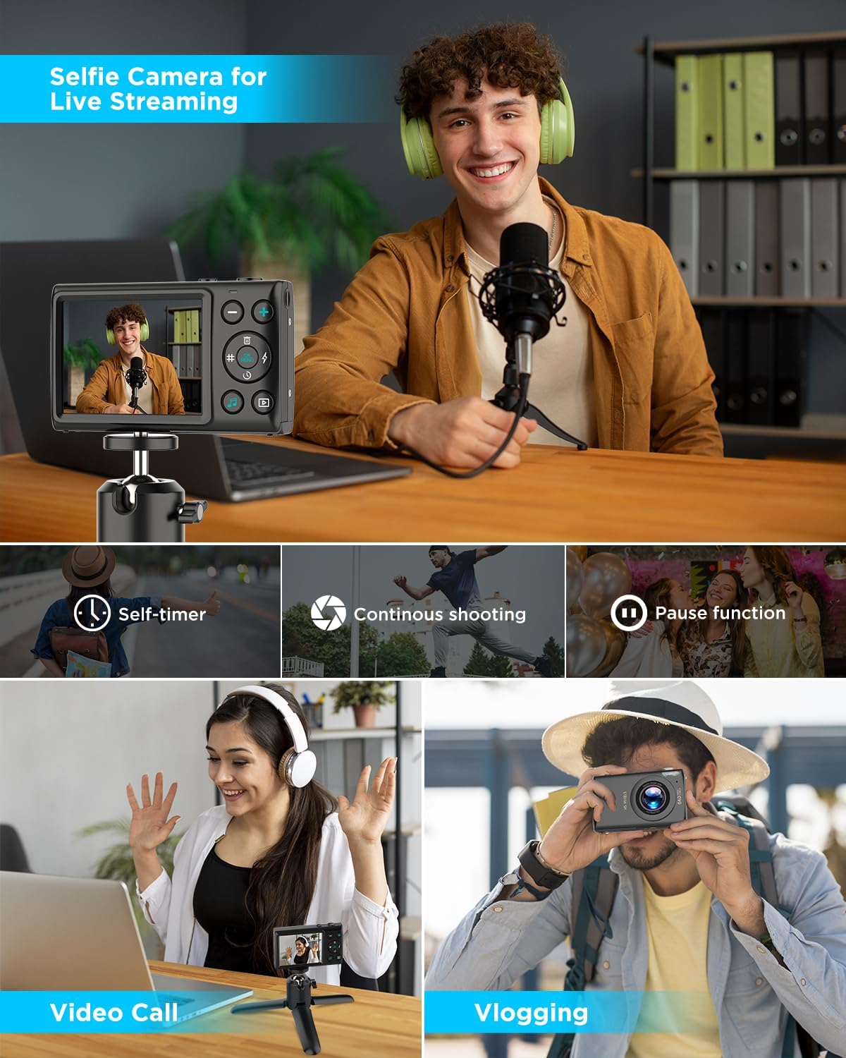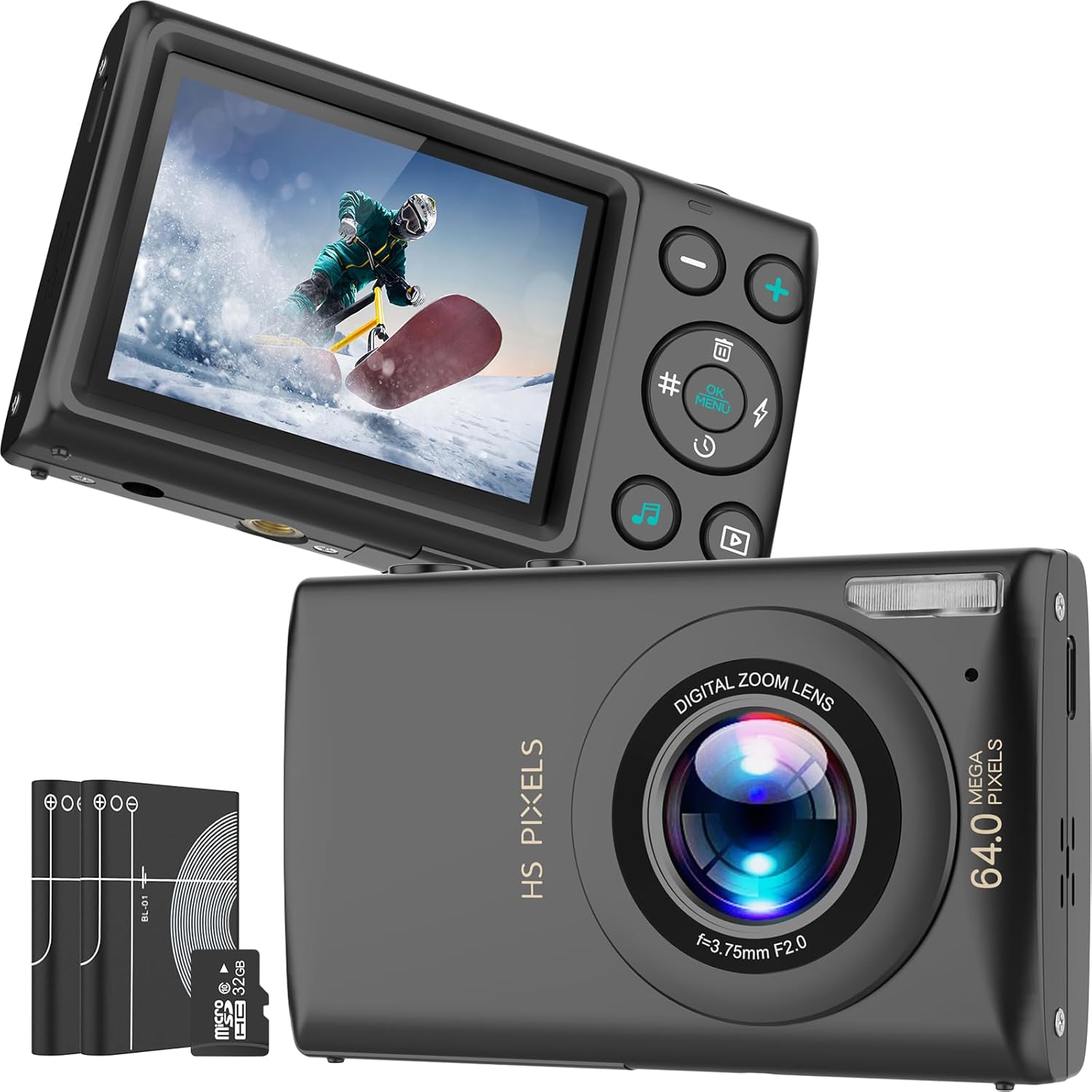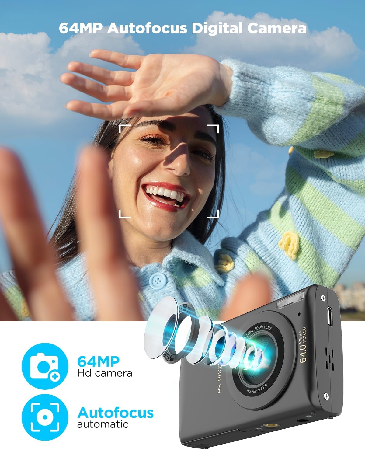 ă64MP Photos & 4K VideoăCrisp, vibrant, and ready to wow! Shoot jaw-dropping 64MP photos (interpolated) and silky-smooth 4K video (or 1080P/60FPS for fast action). Perfect for vlogging, travel diaries, or capturing your kidâs first bike ride in studio-quality detail!