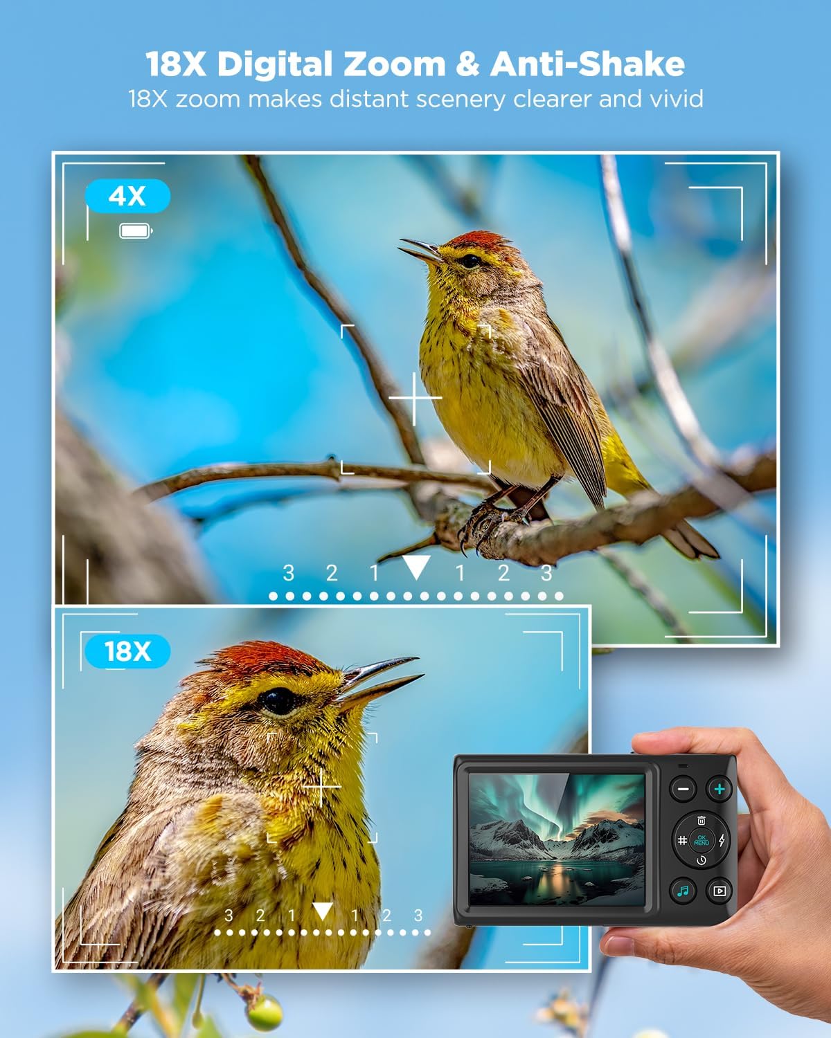 ă18X Zoom + Low-Light MasterăGet closer to the action with 18X digital zoomâideal for wildlife, sports, or concert close-ups. The F2.0 wide-aperture lens shines in low light, turning dim scenes into bright, Instagram-ready masterpieces!