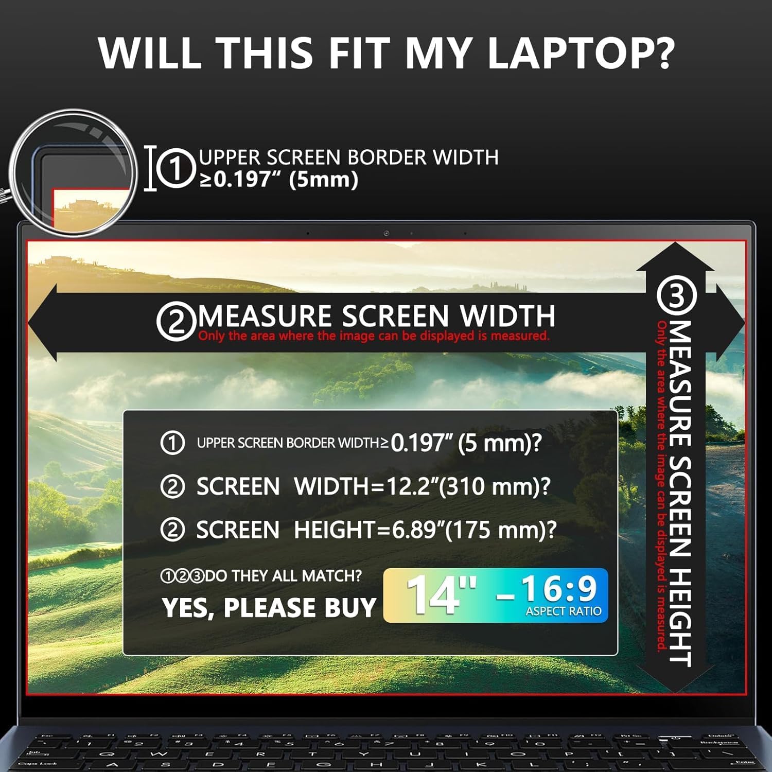 [Please Measure Length & Width] FILMEXT Magnetic privacy screen laptop 14 inch (1920 x 1080) 16:9 ratio (universal-14″, WIDTH: 12 3/16″ (310 mm), HEIGHT: 6 7/8″ (175 mm)). ( Do not fit for 14 inch 16:10 -(1920 x1200 revalution ratio, Do not fit for Think Pad /macbook / microsoft surface or touch screen) .Please confirm width and height for your laptop screen before ordering and feel free to contact us if you have any questions about the size..