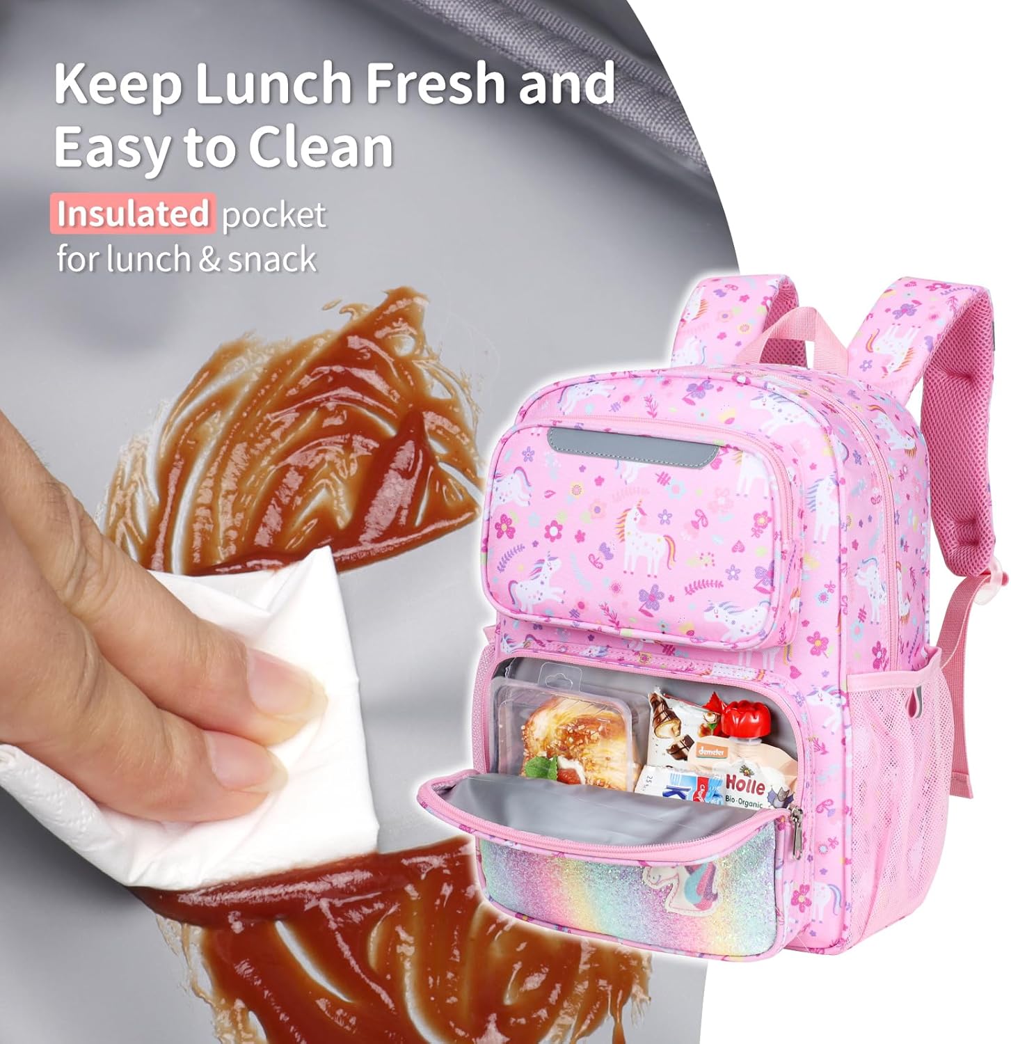 Insulated & Easy-Clean Snack Pocket: The kids bookbag includes a PEVA-lined front pocket to keep lunches fresh and wipes clean in seconds—no fuss!