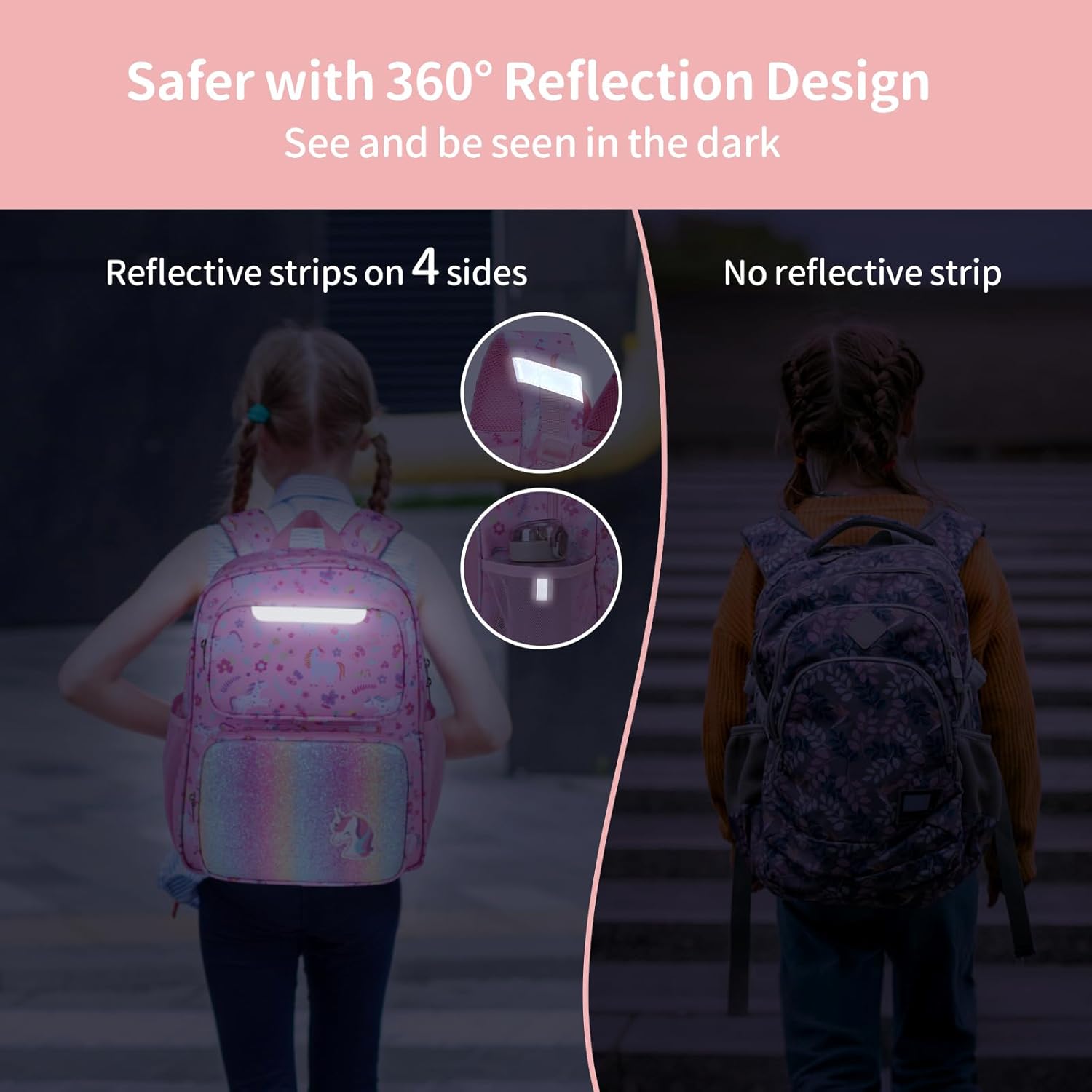Safety First, Day or Night: With 4-sided reflective strips and a whistle buckle, this kindergarten backpack for girls boosts visibility at night and helps kids call for help if needed.