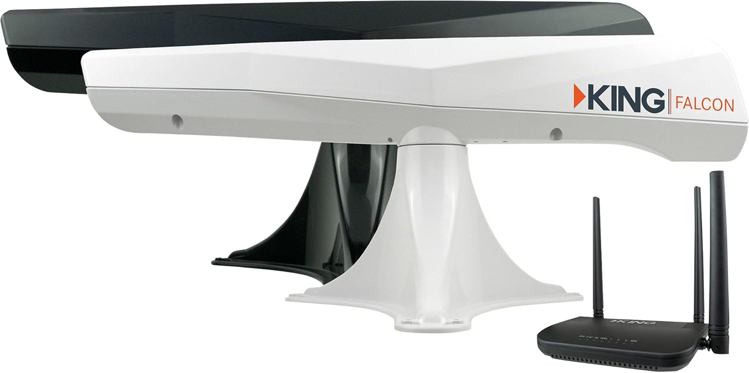 Upgrade your Wi-Fi experience with KING’s superior Wi-Fi products. No more walking to the coffee shop or visitor center to get Wi-Fi while your camping – Now, you can connect right from your vehicle. The KING Falcon is a high-gain, self-pointing, roof-mounted RV Wi-Fi antenna. The KING Falcon provides fast, reliable, secure Wi-Fi anywhere. With the free KING Falcon App, your antenna will find your network and lock on with just a few clicks on your Android or iOS device. No monthly service fee and no contract. A Wi-Fi source is required. The KING Falcon antenna cannot be used as a standalone Wi-Fi hotspot.
