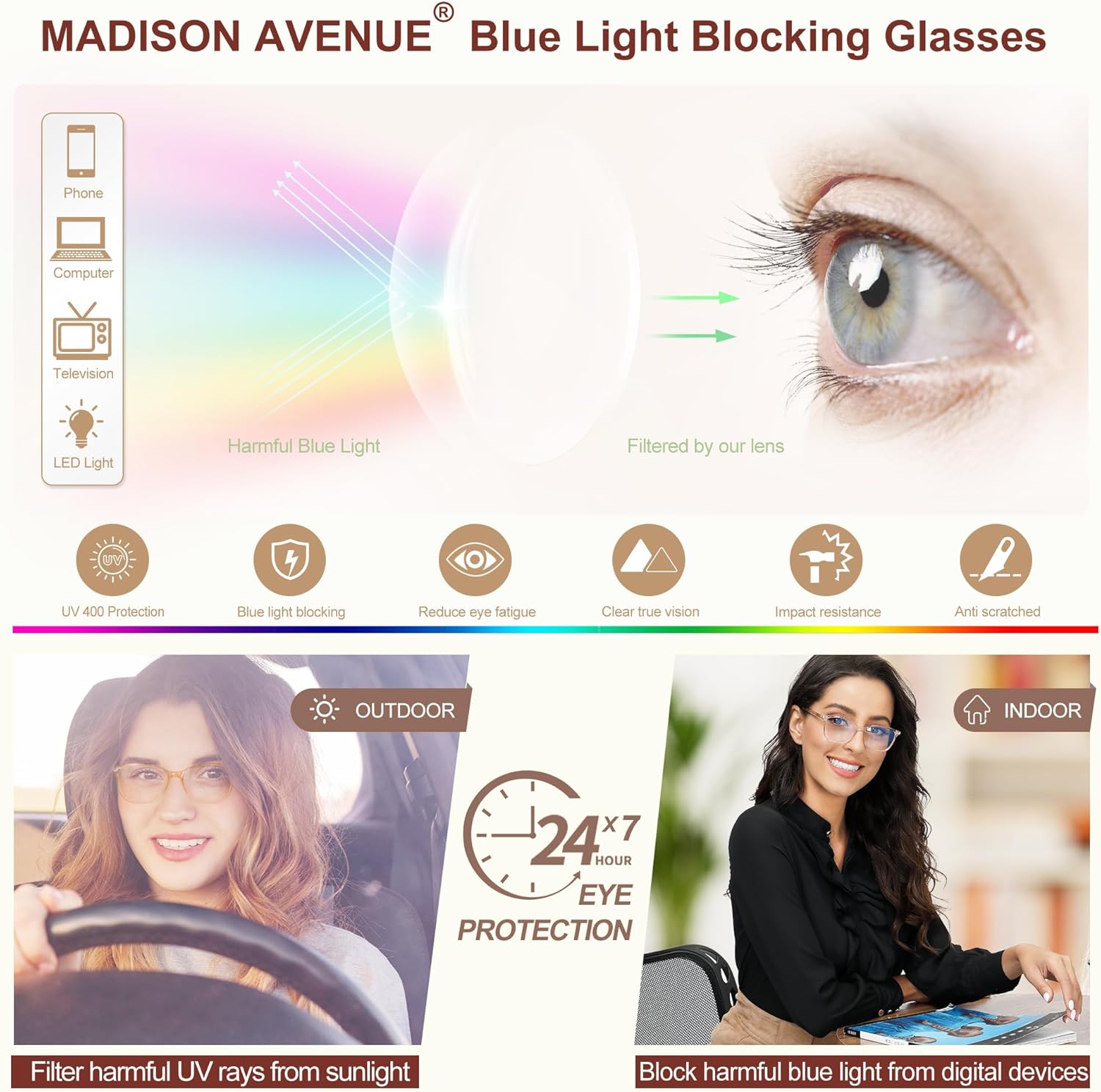 ăMadison Avenue Blue Light Blocking Lensă Filter high level blue light from digital screen of computer, phone and TV,maintain HD clear vision with less color distortion.