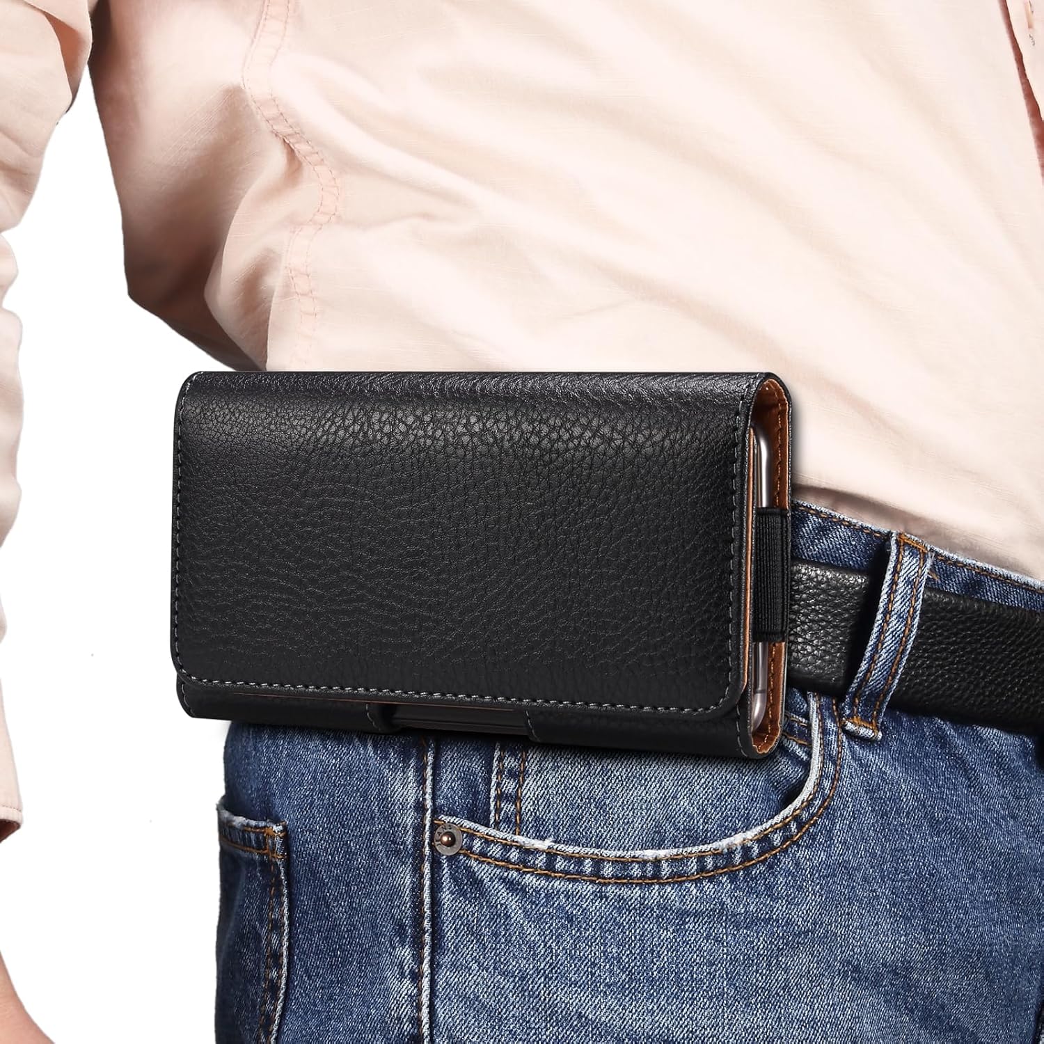 ăConstructionă: The lightweight smart phone carrying pouch is equipped with a fixed belt clip and belt loops, horizontal way and front magnetic closure is quick access to your phone and stable. Hole in bottom allows you to stick a finger in to help push the phone out of the case.
