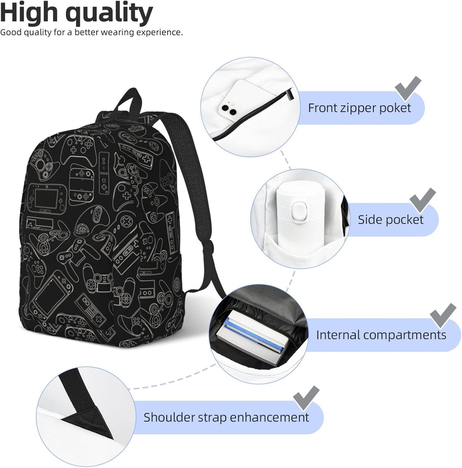 Pockets: 1 × main pocket with a compartment inside, 1 × front zipper pocket, 2 × side pouch. Enougn room to store books, clothes and other everyday items in your daily study, work or travel