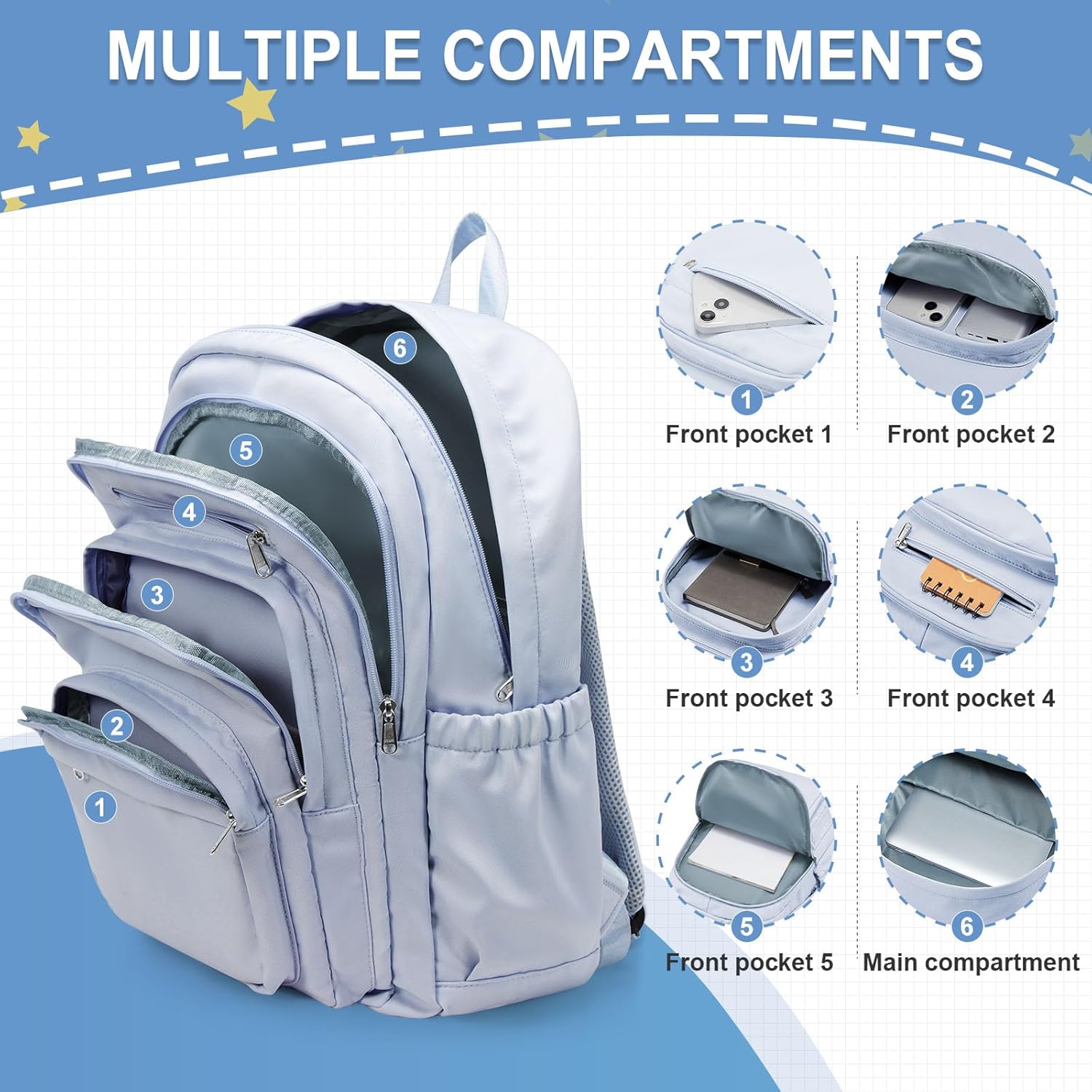 【Large Capacity & Multiple Compartments】This multifunctional schoolbag has a large-capacity main compartment and thoughtfully designed 10+ independent functional areas, including a front zipper pocket, a side elastic net pocket and an internal secret compartment, which can easily classify and store 15.6-inch laptops, stationery, power banks and other personal items. It can meet your needs for school, travel, office and daily life